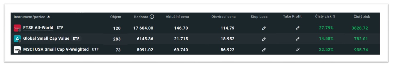 V rámci účtu u XTB stále vlastním ještě jedno ETF – ZPRV (SPDR USA Small Cap Value). To už ale dále nakupovat neplánuji. Postupně jej nahrazuji ETF AVWS, které cílí na stejné faktory (small cap + value), ale globálně a ne pouze na americký trh. Podrobněji jednotlivá ETF popisuji v prvním článku věnovaném mému portfoliu 👉Moje investiční portfolio (ETF).