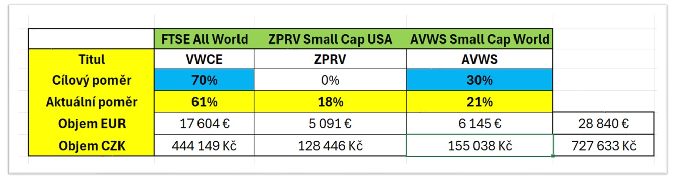 Jakmile mi to umožní časový test, plánují pozici ZPRV prodat a portfolio postupně přiblížit cílové alokaci. Nejbližší nákupy tak budou směřovat především do ETF VWCE.